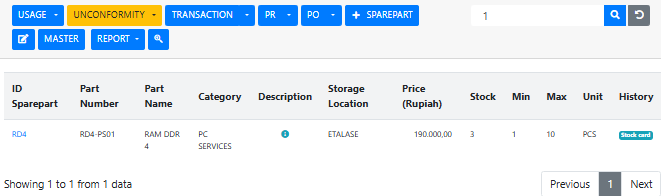 - Akses Menu Sparepart: Setelah memasuki menu Master Data, pilih opsi ‘Sparepart’ untuk melihat daftar sparepart yang tersedia.