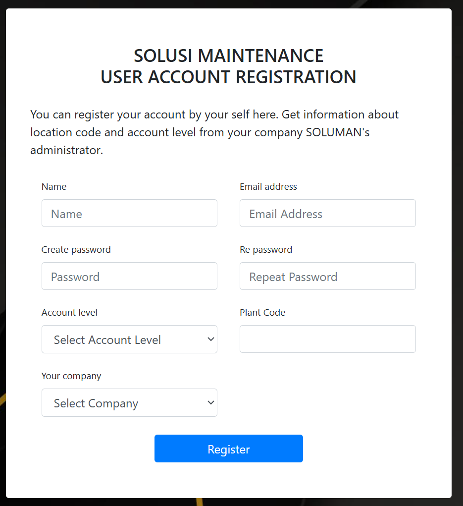 1. Sebelum mendaftar anda harus mengetahui terlebih dahulu level account anda serta plant code. Data ini bisa anda dapatkan dari Administrator Soluman perusahaan anda.