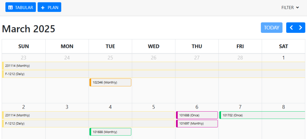 Pada halaman Planner diatas akan tampil kotak-kotak maintenance plan dengan warna biru, kuning, dan hijau yang berisi tag number dan jenis interval maintenance dari perangkat yang telah dibuatkan maintenance plan nya.