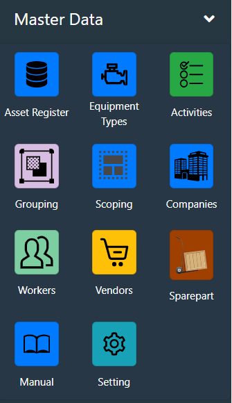 Master Data merupakan group menu yang berisi pengaturan untuk data-data utama aplikasi seperti daftar Equipment, Maintenance Activities, Grouping, Companies, Workers, dan Sparepart.